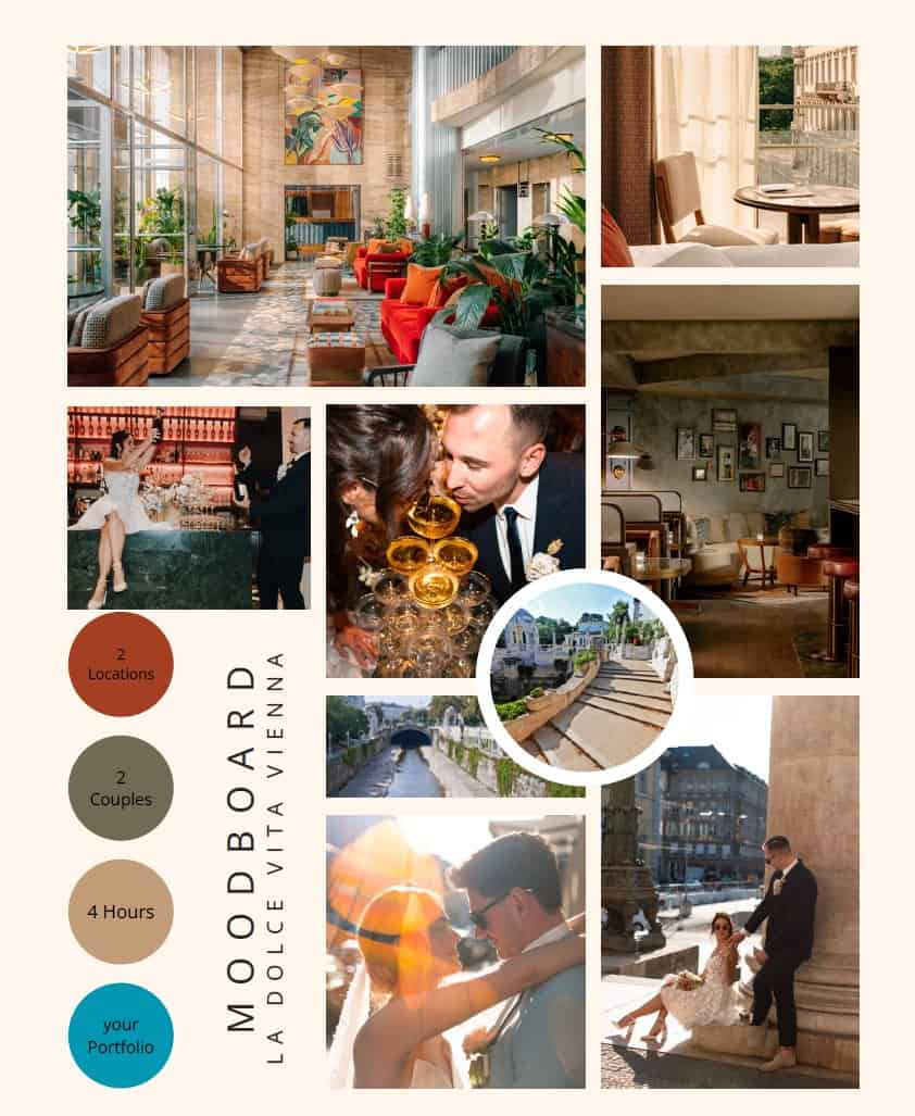 Unser Moodboard gibt dir einen ersten Eindruck vom Portfolio Day Wien – Hochzeitsfotografie Workshop. Es zeigt das stilvolle Ambiente, die Farbwelten und die besondere Atmosphäre, die dich an diesem Tag erwartet. So kannst du dir bereits vorstellen, wie deine zukünftigen Aufnahmen aussehen könnten.